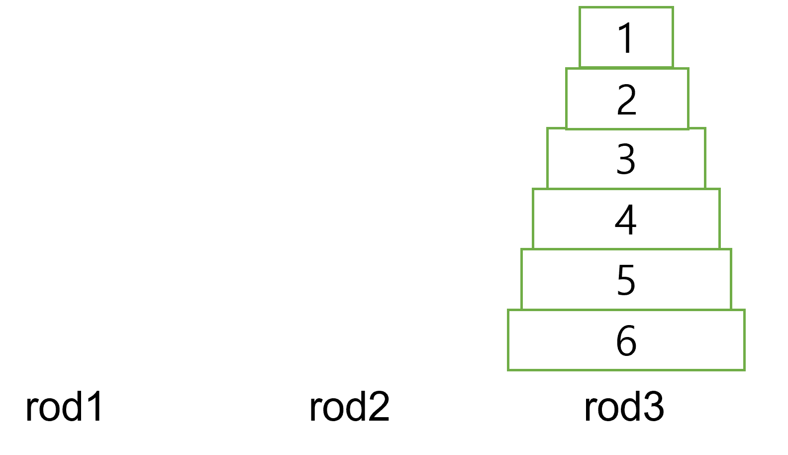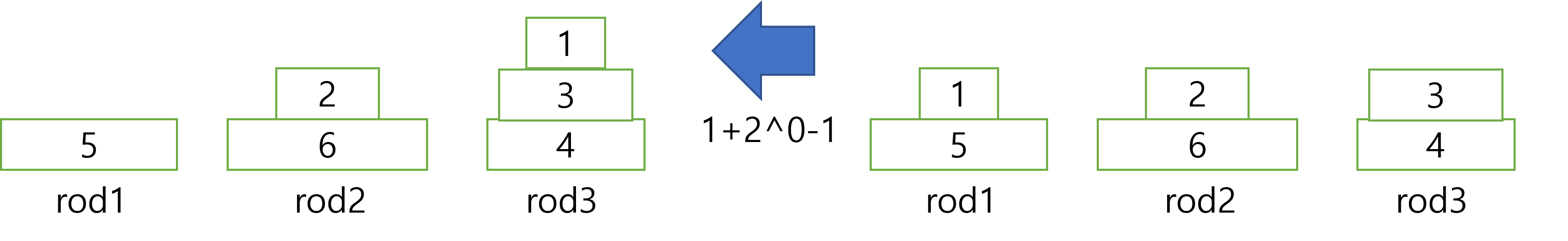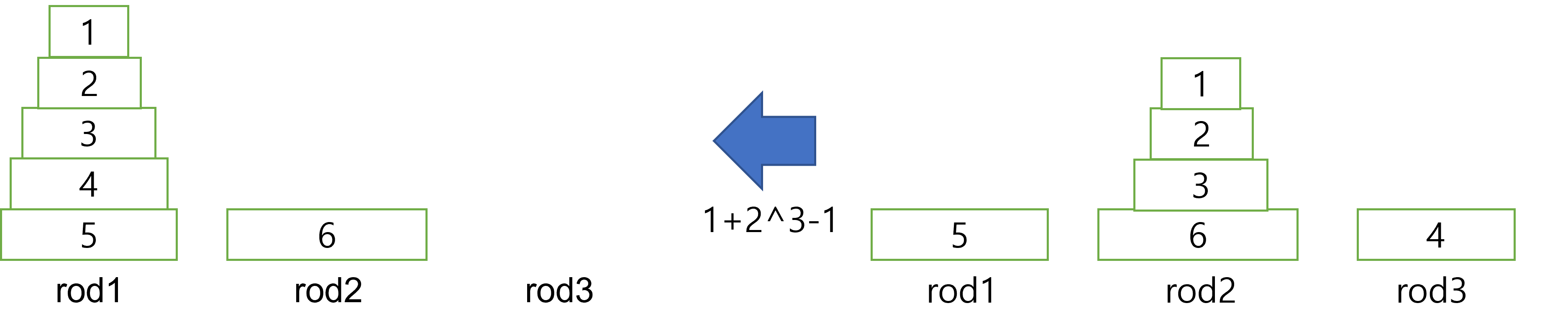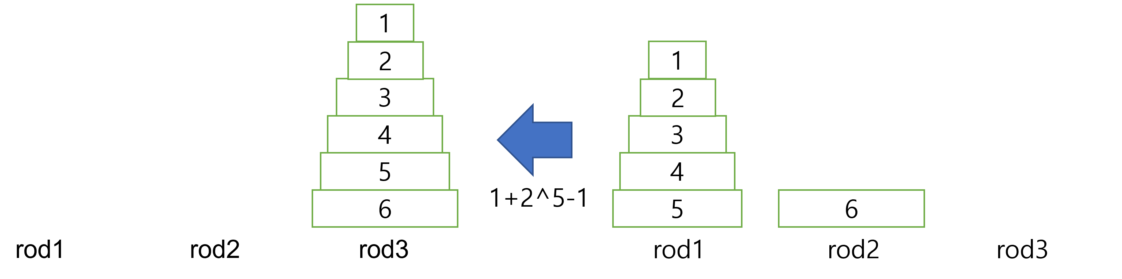 이때, 6번원판을 rod3으로 옮기는 과정(1)과 1~5번 원판을 rod3으로 옮기는 과정(2^5-1)이 더해져 총 횟수는 2^5이 된다.