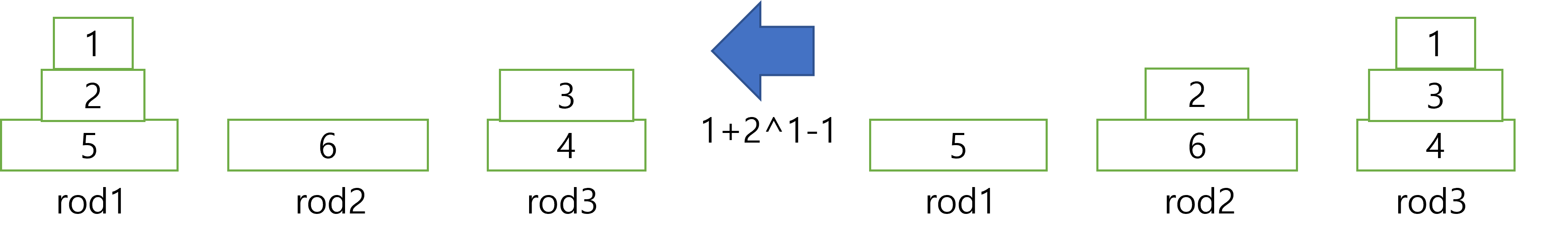 이때, 6번원판을 rod3으로 옮기는 과정(1)과 1~5번 원판을 rod3으로 옮기는 과정(2^5-1)이 더해져 총 횟수는 2^5이 된다.