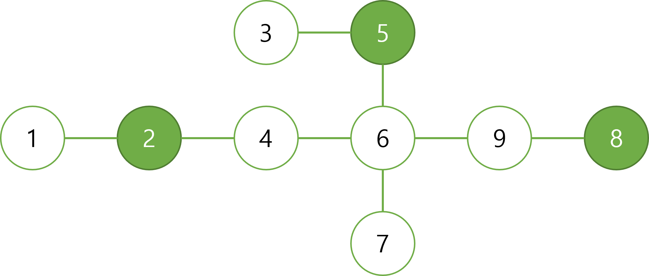 테스트케이스 1번에서 주어진 그래프이다. 위에서 말했듯이 인풋은 항상 스패닝트리로 주어지기 때문에 길게 늘어뜨려서 위와같은 모양을 만들 수 있다.