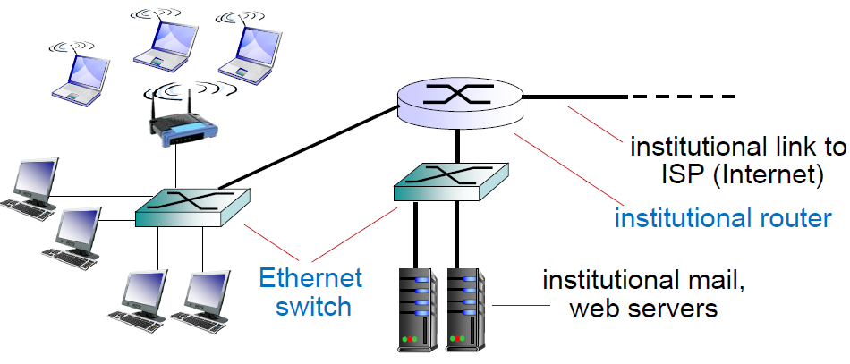 - 이더넷(ethernet) : 기업이나 학교에서 주로 사용하는 방식이다. 각 유저들은 ethernet switch에 연결이 되어있고 이이 스위치들은 더 큰 인터넷 네트워크에 연결되어있는 구조이다.
