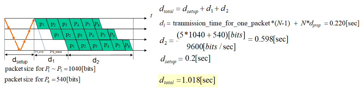 보낼 메시지의 길이가 주어지고 패킷의 크기또한 주어진 것을 볼 수 있는데, 패킷의 헤더사이즈가 40이고 패킷사이즈가 1040이니 한 패킷에 넣을 수 있는 데이터의 양은 1000bits이다. 즉, 5500bits는 5개의 1040 bits와 1개의 540bits 총 6개의 패킷으로 나누어질 수 있다.
