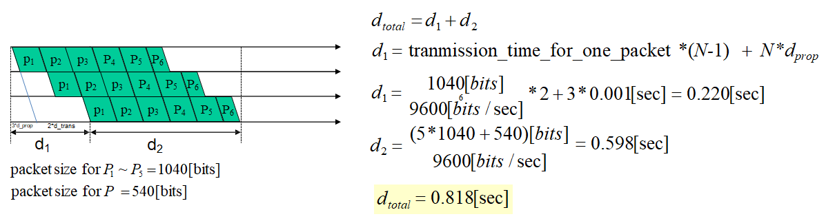 4. propagation delay : physical link에서 src부터 dst까지 travel하는데 걸리는 시간이다. 링크 길이/보내는 속도로 계산할 수 있다.