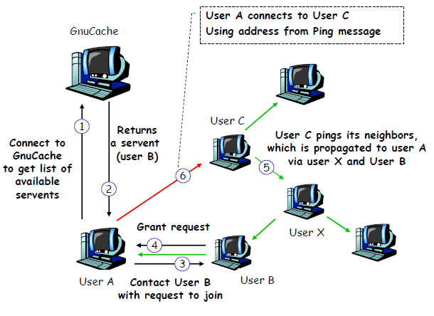 4. User B는 User A에게 OK를 보내고 비로소 User A는 Gnutella nets의 part가 되었고 그중 하나와 연결되었다.