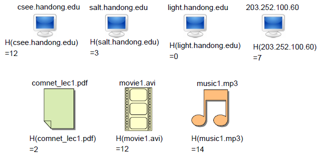 각 peer들과 object들이 해쉬를 통해 ID를 할당 받은 모습이다.