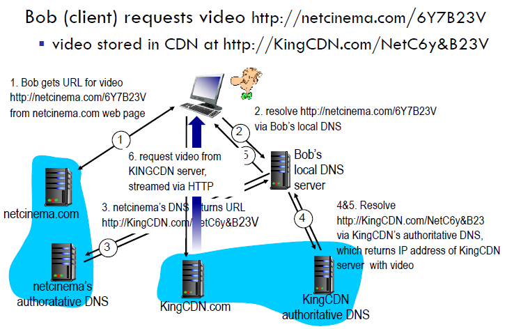 4. Bob의 로컬 DNS 서버는 받은 URL의 IP주소를 얻기 위해 KingCDN의 authoritative DNS까지 쿼리를 날려 해당 동영상의 IP주소를 얻어온다.