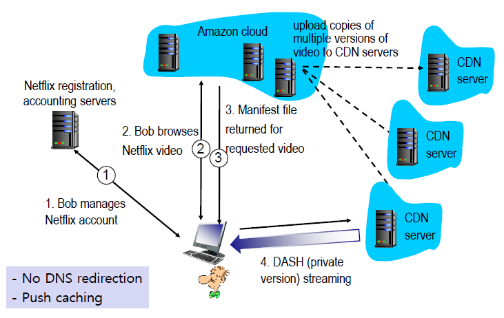 4. Bob은 DASH방식을 통해 CDN server에서 스트리밍을 서비스받는다.