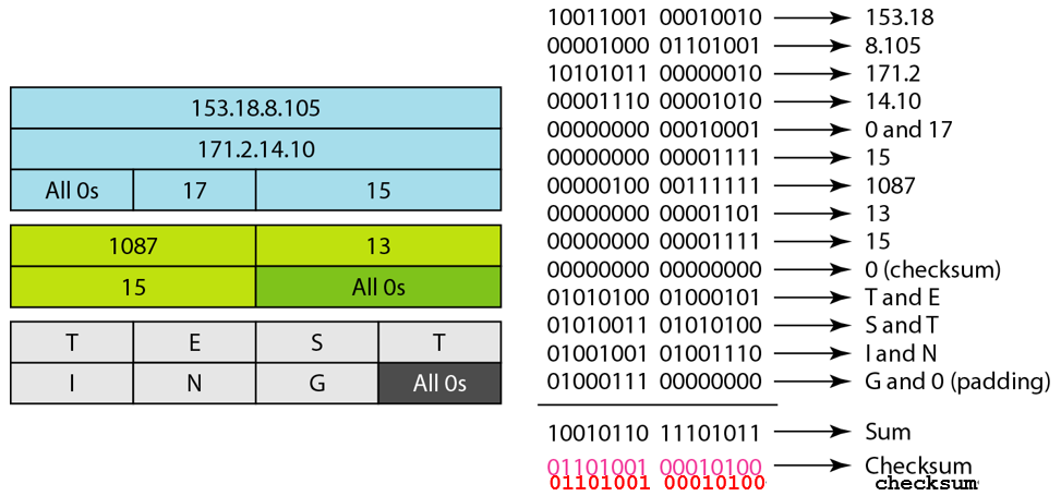 chceksum은 header, data 그리고 pseudo-header의 bit을 모두 더한 후 1's complement(1은 0으로 0은 1로)를 취한뒤 전송한다.
