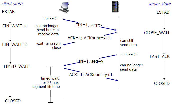 클라이언트 또는 서버는 connection을 닫고싶을때 헤더부분의 FIN bit를 1로 해서 넘겨준다. (둘이 동시에도 가능)
