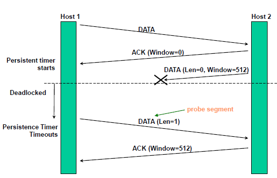 Q. 현재 receiver의 buffer가 꽉차있는 상태이고 sender는 receiver로부터 window size가 0이라고 메시지를 받은 상태이다. 그런데 만약 이상태에서 receiver의 buffer에 여유공간이 생겼고 receiver는 그 사실을 sender에게 보내주려하는데 만약 이 패킷이 loss가 나게되면 어떡할까? (window size에 대한 정보는 header이기 때문에 header에 대한 재전송은 없다)