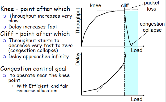 우리는 최대한 throughput과 delay가 knee축에 맞는 정도로 congestion control을 해야한다.