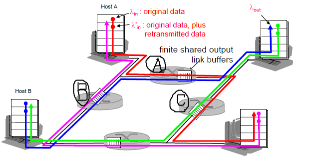 - hostB로부터 출발하여 라우터 B에서 거의 점유를 해서 잘보내진 후에 라우터 A로 갔는데 빨간패킷 때문에 도착지로 전송이 안됨.