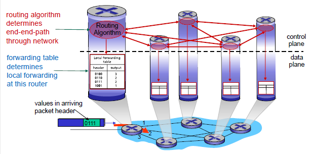 - fowarding : 현재 라우터에서 적당한 라우터로 패킷을 어떻게 전송할 것인가?