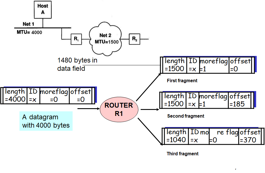 4000byte의 데이터그램을 라우터 R1에서 MTU가 1500인 Net2를 통해 전달하려고 한다.