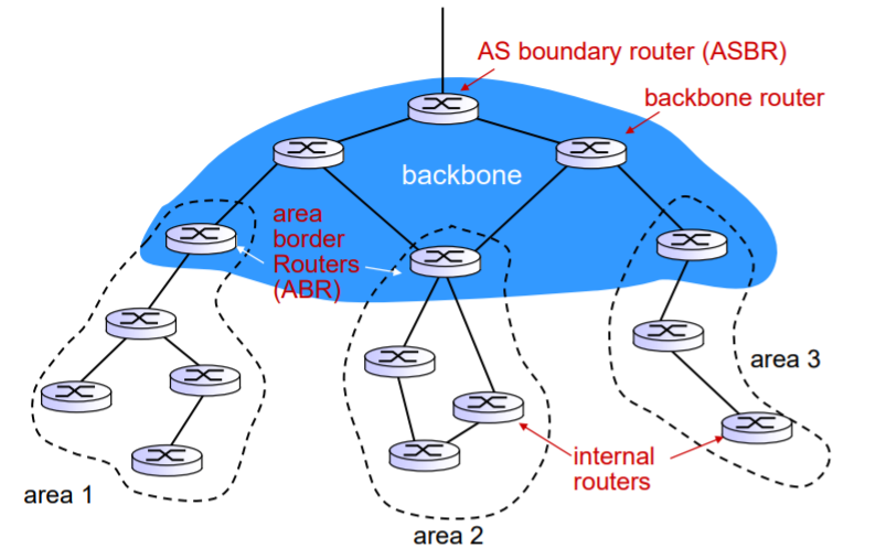 각 area들의 ABR들은 자신의 area에서 수집한 LSP정보들을 backbone에서 공유하고 또한 그 backbone들의 ASBR들은 자신의 backbone에서 공유한 정보들을 다른 AS들의 ASBR들과 공유한다.