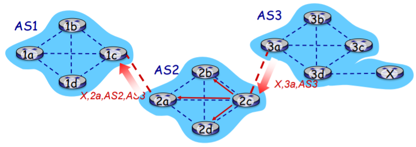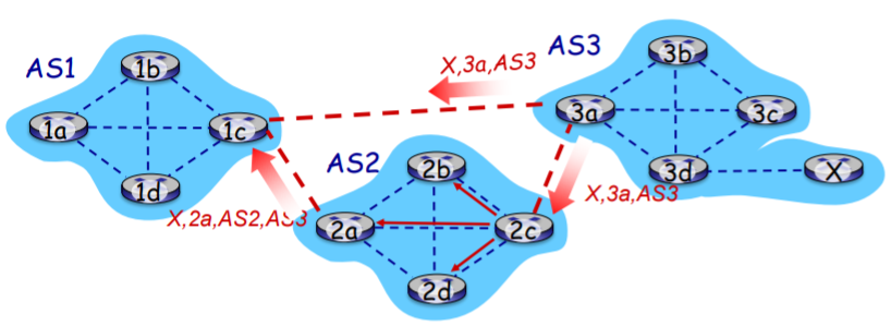 위의 그림처럼 3a가 2c에게 eBGP를 통해 메시지를 보내면 {목적지 X, 자신라우터 3a, 지나온 경로[AS3]}를 묶어 보낸다.