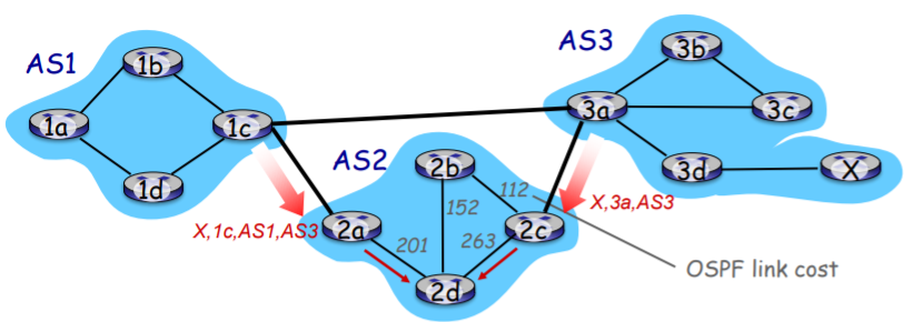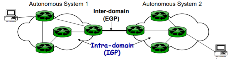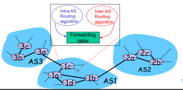 각 AS내부의 프로토콜은 Intra-domain이다. AS2에 있는 host들은 AS1의 내부에서 동작하는 프토로콜을 알지 못한다. 때문에 각 AS는 내부에서 독립적인 프로토콜을 가질 수 있다.