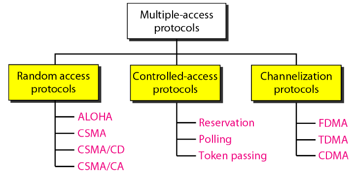 MAC 프로토콜은 크게 세가지 분류로 나누고, 그 안에서 여러 종류의 방법이 있다.