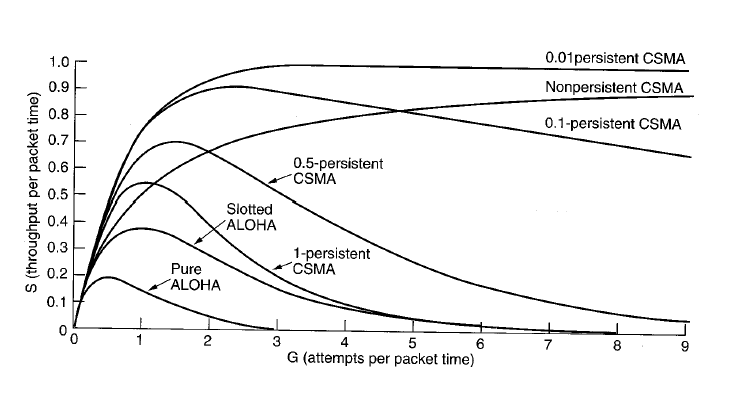 지금 까지 알아본 방식, 그리고 p-persistent에서 p를 바꿔가며 성능을 측정하면 다음과 같다.