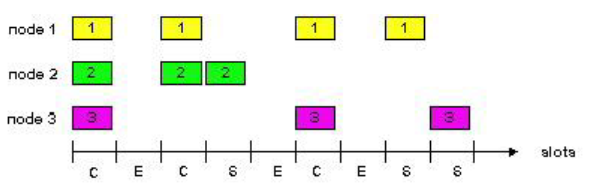 똑같은 사이즈의 slot으로 시간이 나누어지는 개념이다. 때문에 노드들은 동기화가 되어있다.