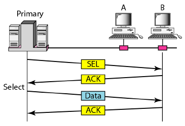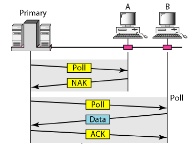 master는 지속적으로 slave들에게 자신에게 보낼 데이터가 있냐고 물어본다. (polling) 그리고 slave는 없다면 NAK을, 있다면 데이터를 보낸다.