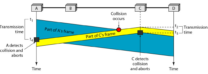위와 같이 A는 t4에서 충돌이 났음을 인지하고, C는 t3에서 충돌이 났음을 인지하여 서로 각각의 시간에서 전송을 중단하는 것이다.