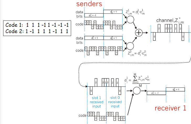 사용자1과 사용자2는 모두 각각 자신이 보낼 데이터에 자신의 코드를 곱했고 그 최종 데이터를 모두 더해 recevier에게 보냈다. 해당 데이터를 받은 receiver는 거기에 원하는 사용자의 코드를 곱해 해당 사용자가 보낸 데이터만을 정확히 복원할 수 있다. (이 부분 때문에 모든 코드는 서로 곱해서 0이 되어야 함)