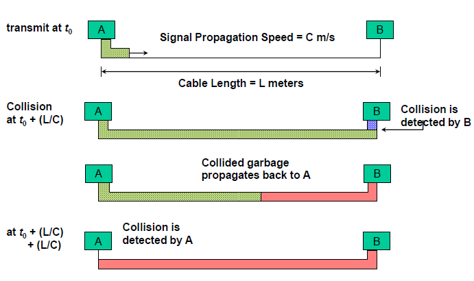 극단적인 상황에서 B는 A가 보낸 데이터를 보기 직전에 망이 IDLE하다고 판단하여 데이터를 보낸다. 그렇게 B가 보낸 데이터를 A가 알기까지는 위의 예제에서 (worst case) 2*propagation delay라고 할 수 있다.