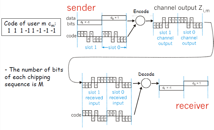 sender는 자신이 보낼 데이터에 자신이 할당받은 코드를 곱해 보내주고, receiver는 받은 데이터에 해당 사용자의 코드를 다시 곱해 디코딩하는 방식이다. 지금은 사용자가 한명이기 때문에 굳이 이런 방식을 사용할 필요가 없지만 사용자가 두명 이상이 되게 되면 얘기가 달라진다.