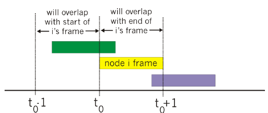 위와 같이 노란색노드가 데이터를 보낼때 충돌이 안나기 위해선 [t0, t0+1]동안은 아무도 데이터를 보내면 안된다.