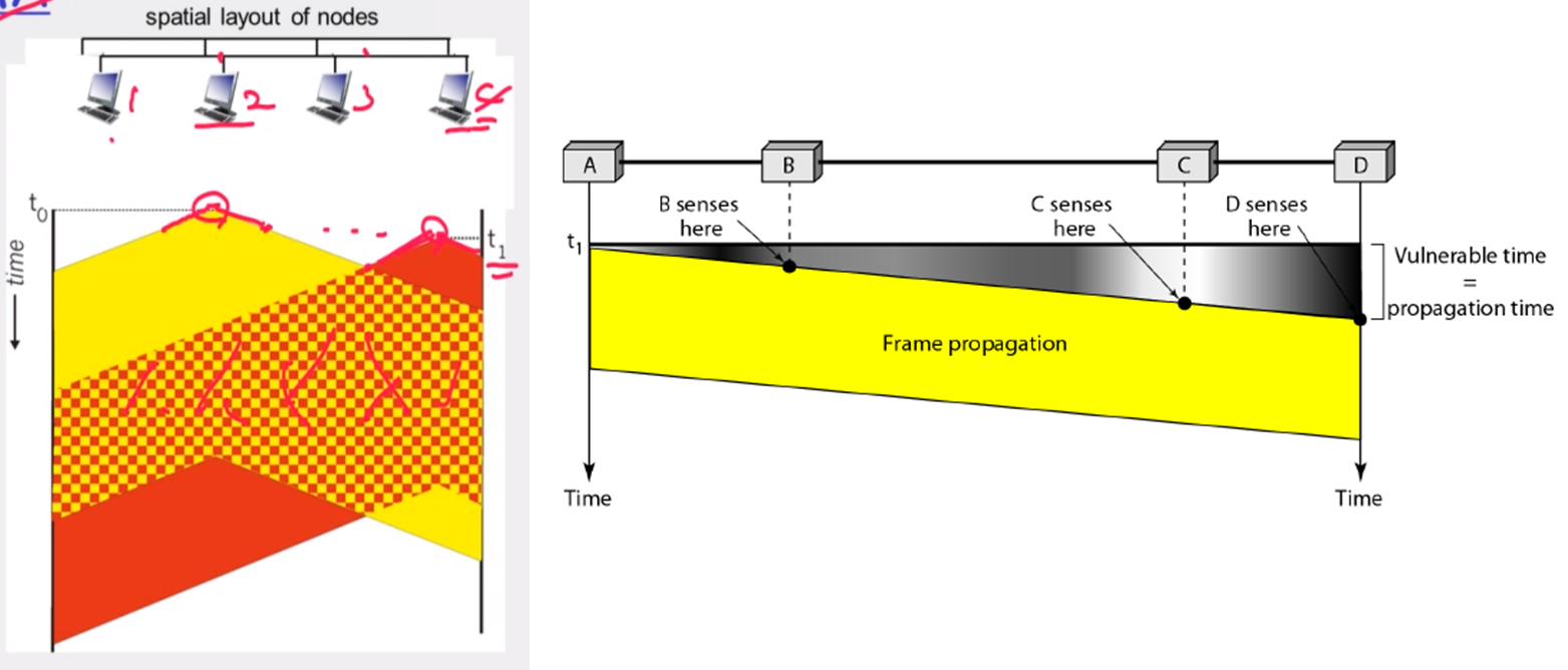 2번 node가 channel이 빈것을 확인하고 자신의 데이터를 보내기 위해 망을 사용하고 있다. 하지만 propagation delay가 존재하기 때문에 해당 링크의 모든 부분에 동시에 이 상황을 알릴 수가 없다.