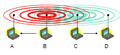 위와 같이 B는 A에게 프레임을 전송하고 있고, 그 영역에 C가 걸친다.