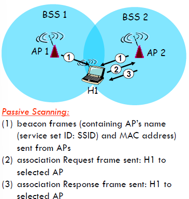 AP들이 host에게 먼저 신호를 보내고 여러 AP들로 부터 신호를 받은 host는 그 중 신호가 가장 센 AP를 선택한다.