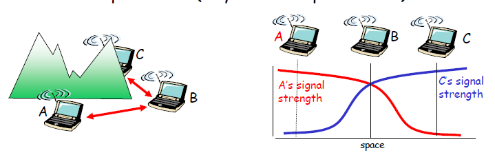 이렇게 되면 CSMA방식에서 C가 만약 channel 상태를 확인할 때 A의 신호를 온전히 받을 수 없기에 제대로 판단할 수가 없다.
