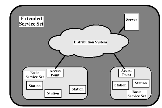 DS(distributed system)이라고 불리는 backbone network에 BSS들이 서로 연결되어 있는 SET
