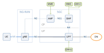 구조를 살펴보자. 엔티티들의 이름이 바뀌었는데 녹색 네모로 기존 LTE구조에서의 엔티티 역할들로 짝지어져 있다.