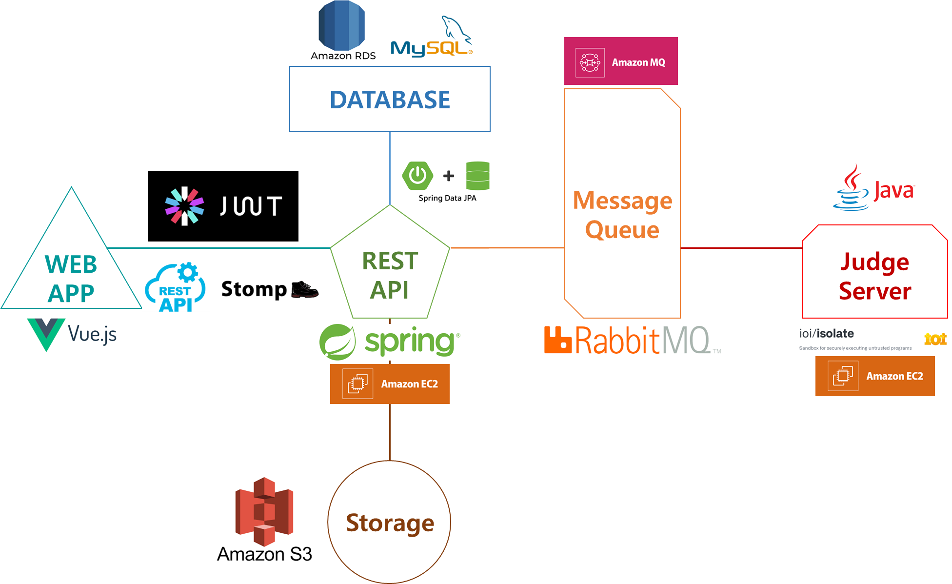 프론트는 한 팀원이 Vue.js 프레임워크를 이용해 맡고 있고, 나는 메인 서버 개발 그리고 나머지 한 팀원은 채점서버를 구현하고 나와 같이 메인 서버 개발을 같이하고 있다.