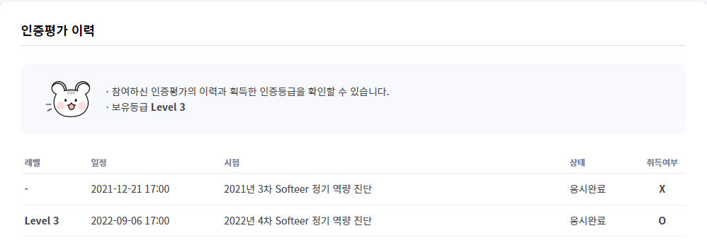 이런식으로 취득 못하면(작년 3차) X로 뜨고 취득하면 O로 뜬다.
