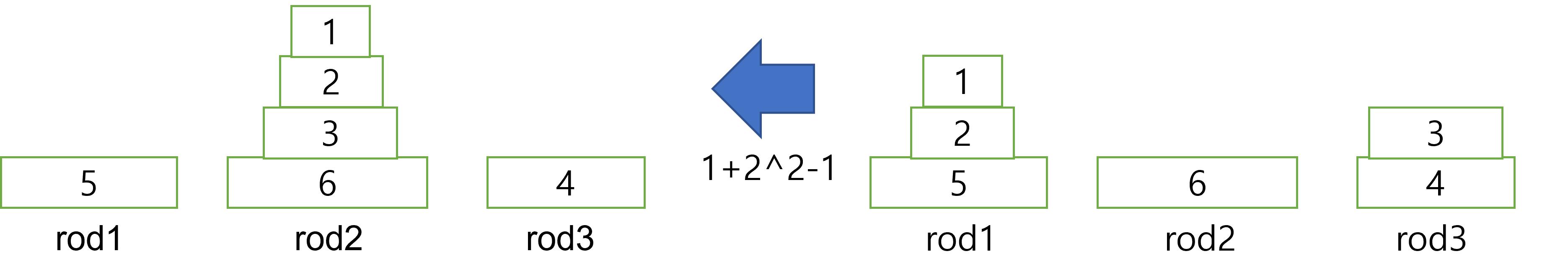 이때, 6번원판을 rod3으로 옮기는 과정(1)과 1~5번 원판을 rod3으로 옮기는 과정(2^5-1)이 더해져 총 횟수는 2^5이 된다.