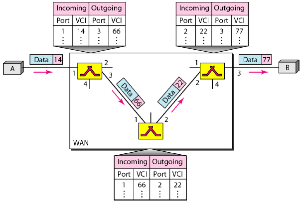 일단 이 방식은 각 스위치에 테이블이 존재한다. 이 테이블은 오고 나가는 패킷의 포트번호와 VCI번호를 저장하는데 이때 VCI는 global이 아닌 local identifier이다.