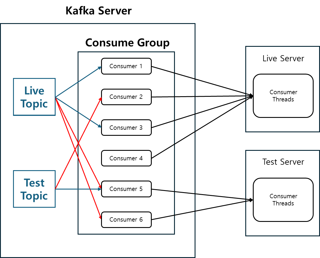 - 즉, 테스트와 라이브 환경에서 사용하는 카프카의 서버는 같다. (각 서비스는 토픽만 구분해 사용)